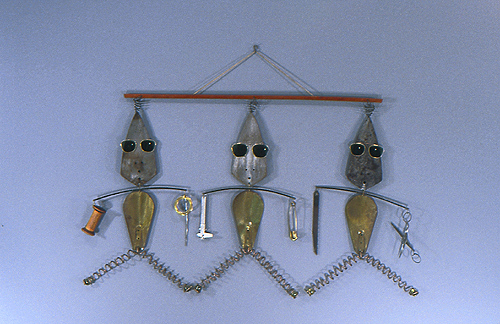 (trowels, sunglasses, spool, needle, 5" safety pin, scissors, saw blade, calipers, brass fan blades, wire)