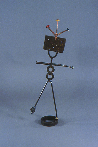 (iron ring, stove poker, 9" spike, brass nuts, chain link, oven rake, twig, beads)