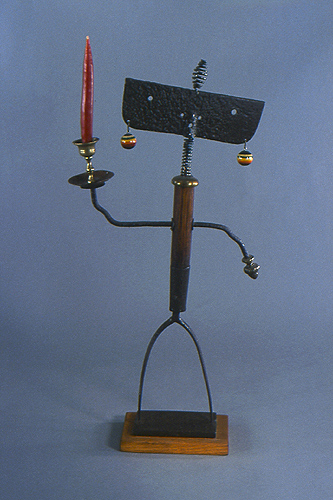 (pitchfork, hoe, painted balls, springs, brass acorn)